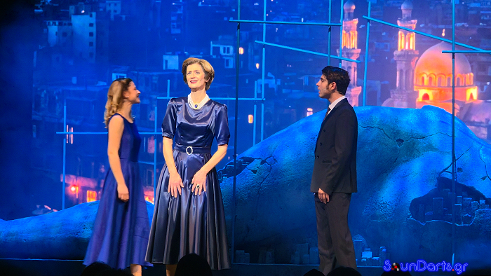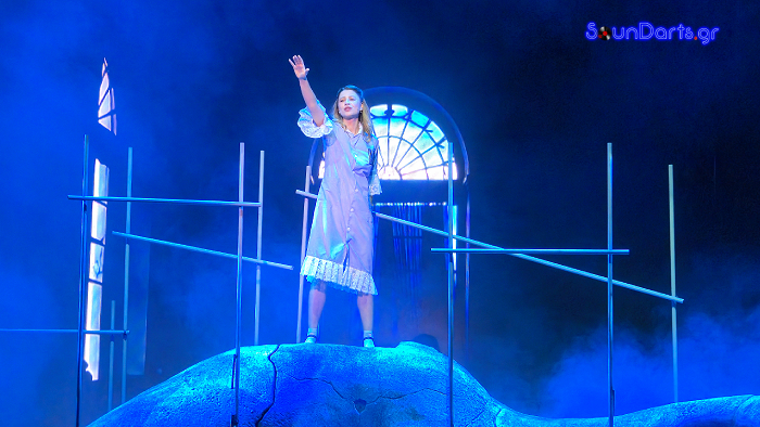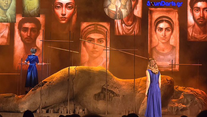 Η σκηνογραφική προσέγγιση συμβάλλει αποφασιστικά στην επιτυχία της παράστασης. Το τεράστιο άγαλμα-πόλη, οι φωτισμοί που αλλάζουν διακριτικά τον συναισθηματικό τόνο κάθε σκηνής, οι προσεγμένες ενδυματολογικές επιλογές που μετακινούν τον θεατή μέσα στον χρόνο χωρίς κραυγαλέες αποδείξεις, δημιουργούν μια ατμόσφαιρα που νιώθεις παρά βλέπεις. Δεν υπάρχουν περιττές υπερβολές· μόνο ένα σύνολο που χτίζει με συνέπεια έναν ολόκληρο κόσμο.