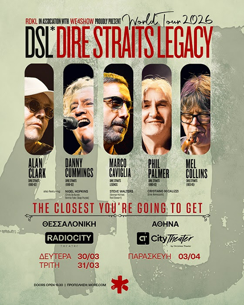 Η άνοιξη του 2026 φέρνει ξανά στην Ελλάδα τον ήχο ενός από τα πιο εμβληματικά rock συγκροτήματα όλων των εποχών. Οι Dire Straits Legacy έρχονται για τρεις ξεχωριστές, καθηλωτικές εμφανίσεις, προσφέροντας στο ελληνικό κοινό την σπάνια ευκαιρία να βιώσει ζωντανά τα αξεπέραστα τραγούδια των Dire Straits, σε συνθήκες ιδανικής ακουστικής και απόλυτης οπτικής εμπειρίας.