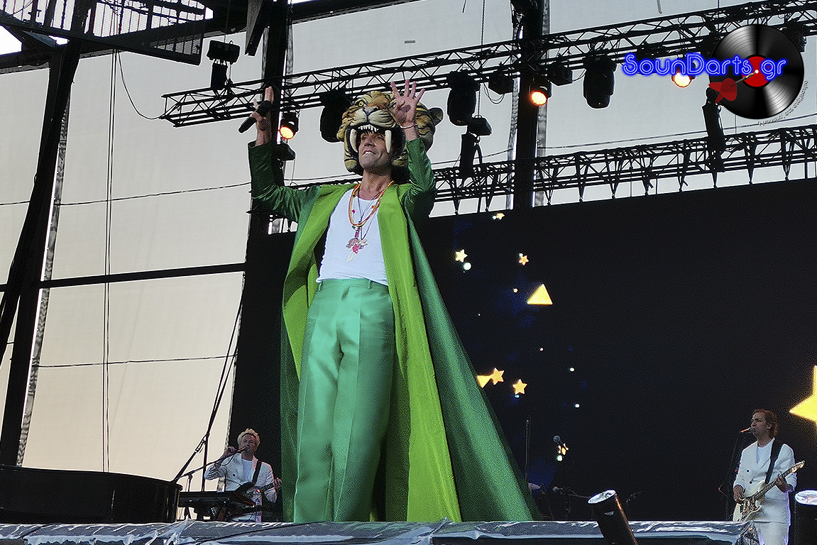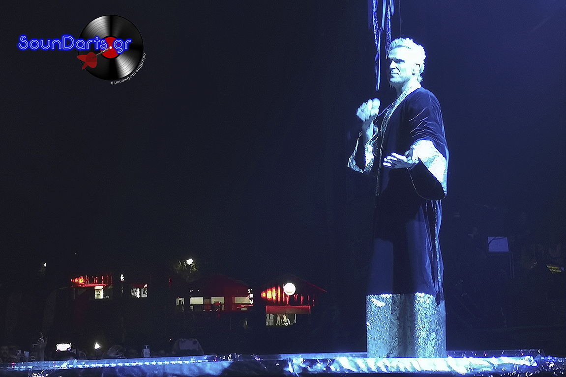 Ολοκληρώνοντας την εμφάνισή του, λοιπόν, τα εντυπωσιακά σκηνικά για το act του Robbie Williams αρχίζουν να στήνονται και στις 22:30 ο headliner της βραδιάς ανέβηκε στη σκηνή με τα φωτιζόμενα παραβάν να αποκαλύπτουν τον ίδιο και την ομάδα του σα μία οργανωμένη, μουσική πανδαισία. Όπως και το 2015, έτσι και τώρα, το “Let Me Entertain You” ήταν το τραγούδι-δήλωση με το οποίο “άνοιξε” τη δική του εμφάνιση. Συγκρίνοντας τις δύο του εμφανίσεις στην Ελλάδα όμως, αυτή τη φορά η παρουσία του επί σκηνής ήταν σίγουρα πιο παιχνιδιάρικη κι ανάλαφρη, παροτρύνοντας εξαρχής το κοινό να συμμετάσχει στο set του.