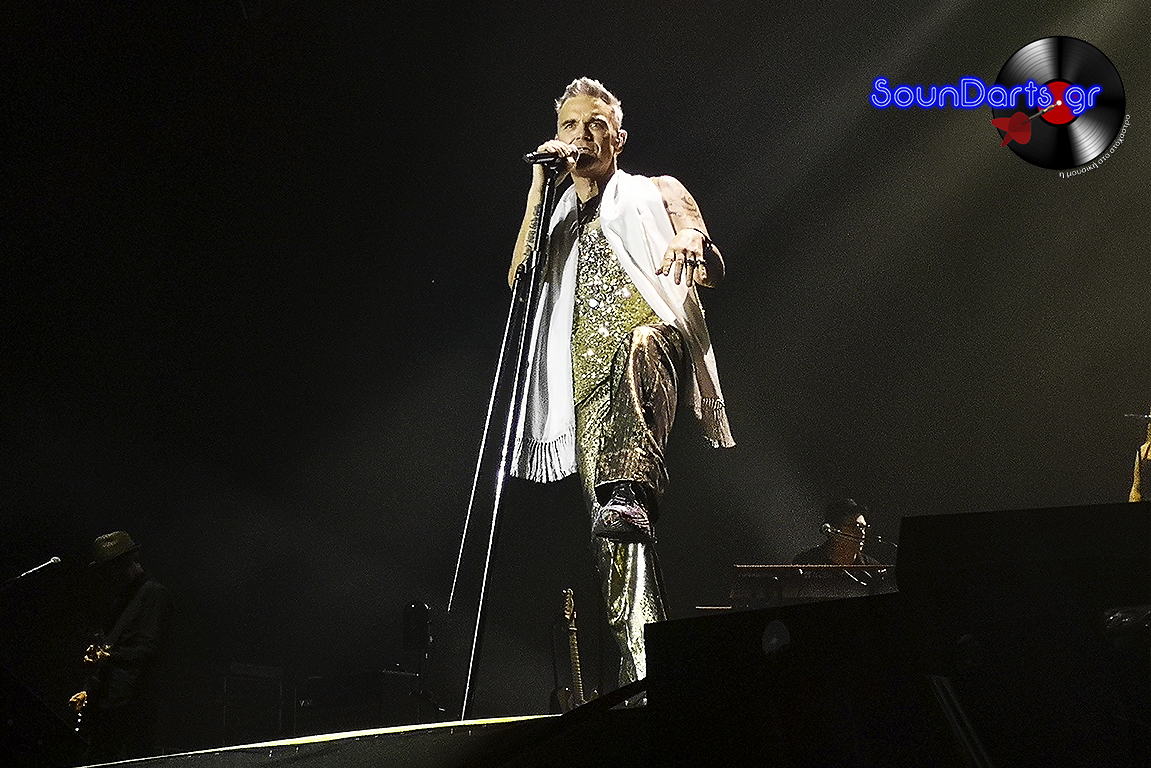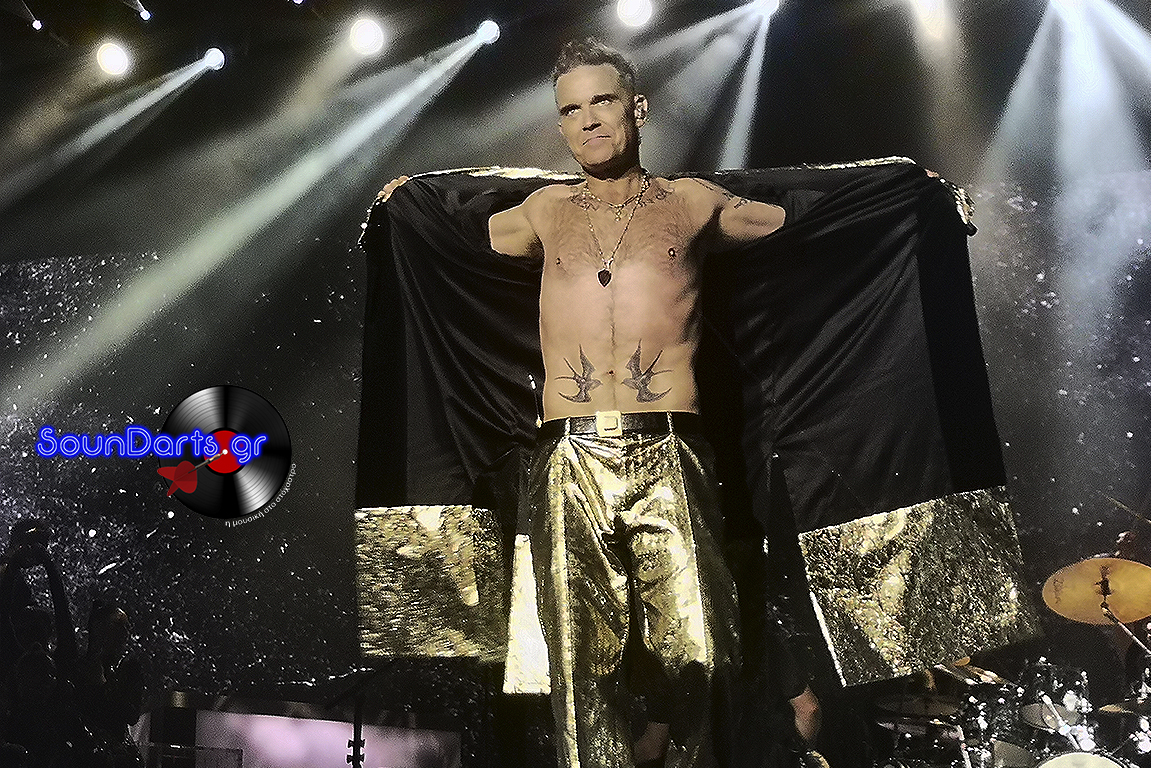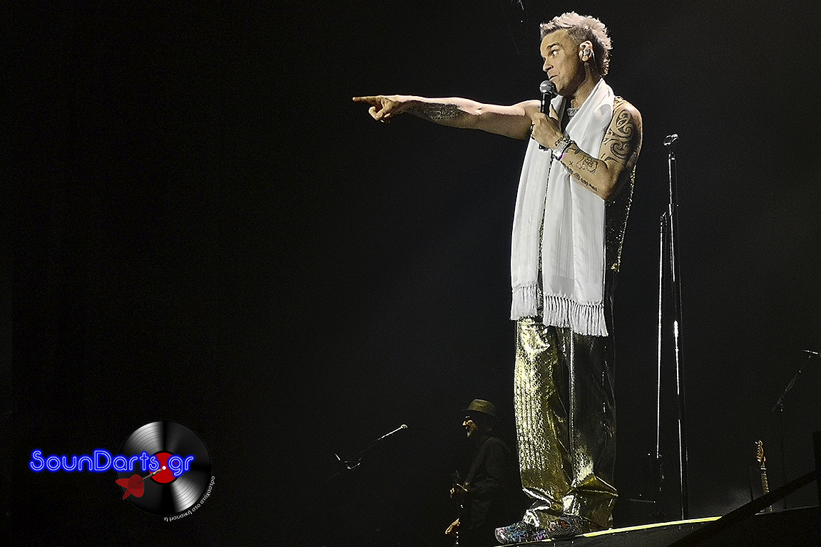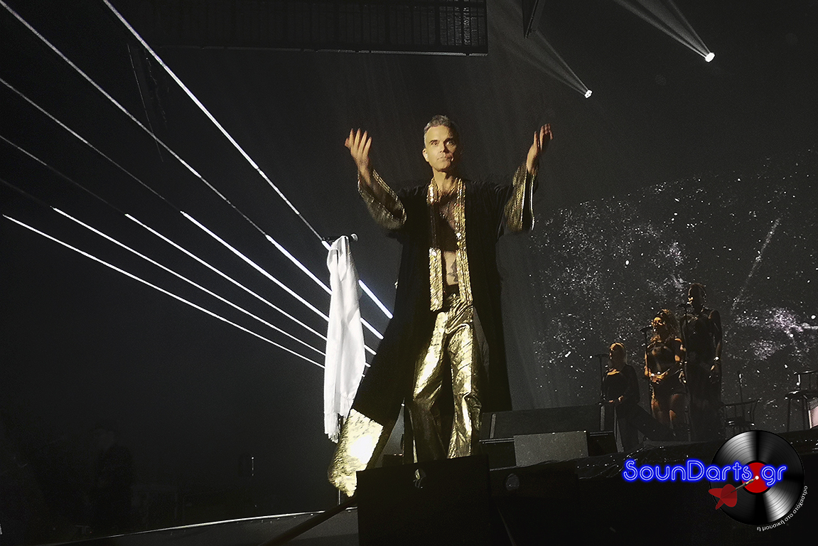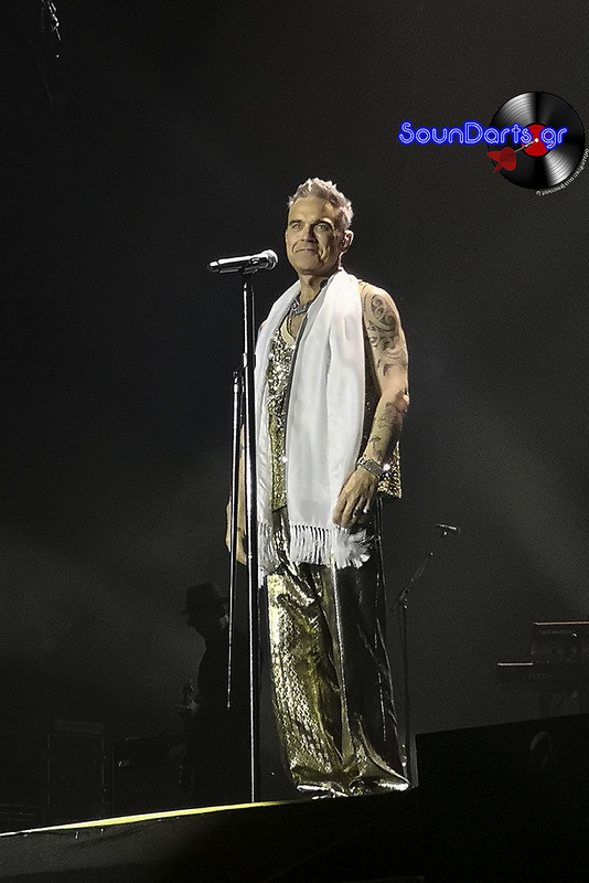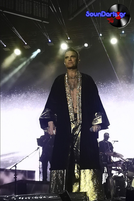 Ο ντυμένος στα χρυσά Robbie επέλεξε να μιλήσει αρκετά με το κοινό, να γνωριστεί μαζί του (βλ. τον Δημήτρη και την Ρία, που στον μεν έκανε πλάκα και στη δε αφιέρωσε το “She’s The One”), ενώ το ενδιαφέρον του φαίνεται πως μονοπώλησε η σύνδεσή του με τους Take That. Μάλιστα, στο set του συμπεριέλαβε και τραγούδια του συγκροτήματος στο οποίο συμμετείχε στα ‘90s, όπως το “The Flood”, ενώ δε δίστασε να διασκευάσει το “Could It Be Magic” του Barry Manilow, αλλά και το “Don’t Look Back In Anger” των Oasis.